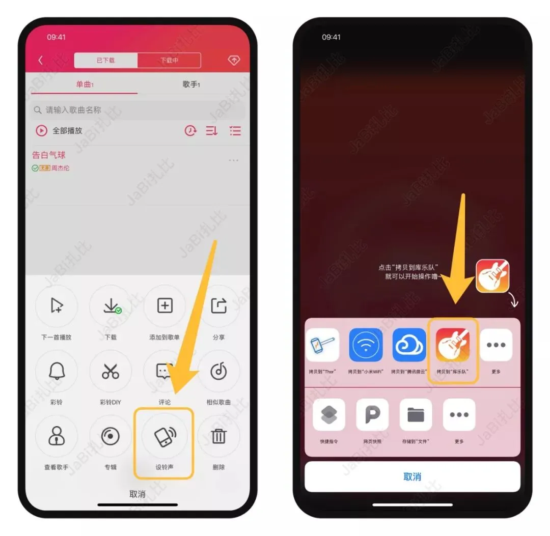 我们可以通过点击菜单中的「设铃声」后,就可以直接跳转到「库乐队」来设置铃声了。