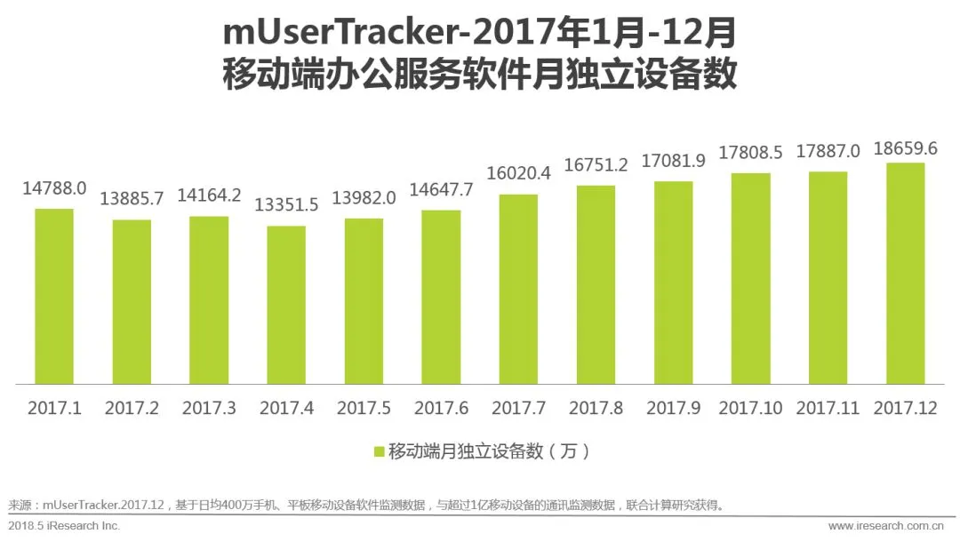 随着人们的生活服务向移动端迁移,移动办公服务软件的渗透率也在稳步上升中。2017年上半年,移动端办公服务软件月独立设备数基本稳定在1.4亿左右。而从下半年开始,移动端办公服务软件月独立设备数开始稳步上升,并在2017年12月达到1.86亿。