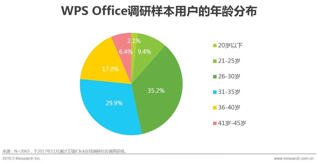 通过线上问卷的方式,本次调研共抽样获得2065名WPS Office用户,其中26-35岁的样本占总样本的65.1%,其次为36-40岁的用户(17.0%)。这一年龄段的用户正是城市中的核心工作人群,承担着一定的工作压力,可支配收入虽然尚在积累当中,但刚性消费需求较大。此外,本次调研抽样获得的WPS Office用户中还包括了10%左右的25岁及以下年轻学生人群,由此可见学校也是WPS Office的使用场景之一。总体来说,WPS Office用户结构健康,为产品的持续稳定发展奠定了基础。