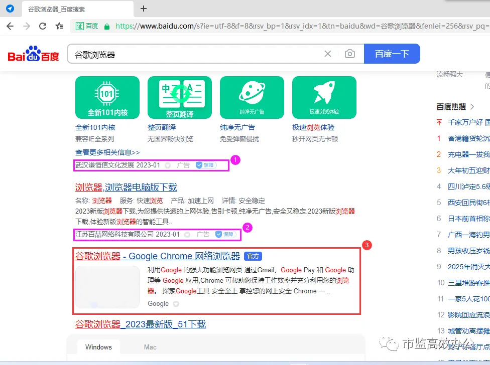 ③即是我们要找的官网,它的特征是,有百度标记的蓝底白字的“ 官方 ”二字,在下方有“Google”字样,点击这条记录。
