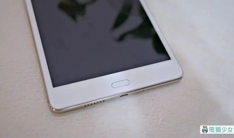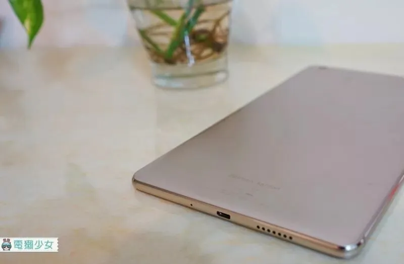 转过来背面宇恩觉得「HUAWEI MediaPad M3 Lite」的金色机背很有质感,它不是一般常见的那种有各种光泽又闪亮著珠光的金色,而是设计成有点雾面、饱和、给人很温暖的感觉!