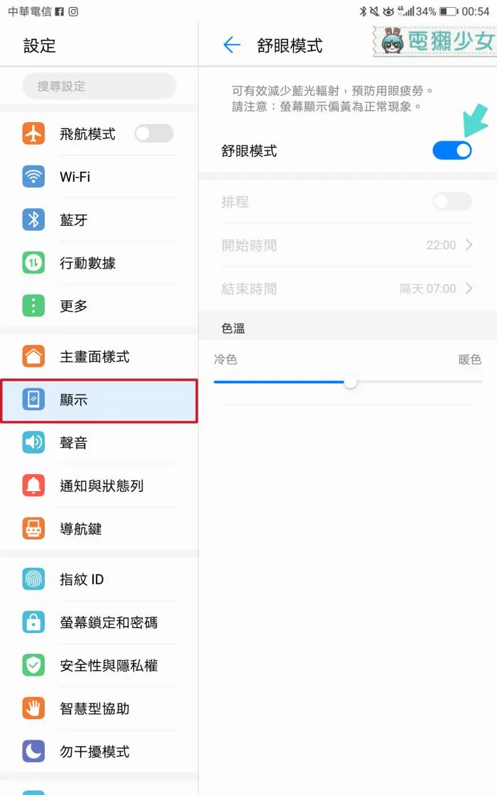 一般我们的屏幕都是比较偏冷色调,长时间盯著屏幕看的话会对眼睛产生比较多的刺激,但是只要在「设定」>>「显示」>>开启「舒眼模式」之后屏幕就会变成暖色调,百分比程度还可以自行调整,宇恩觉得眼睛的疲劳感会少一点,对习惯长时间观看影片或浏览网页的人来说应该会有蛮大的帮助!