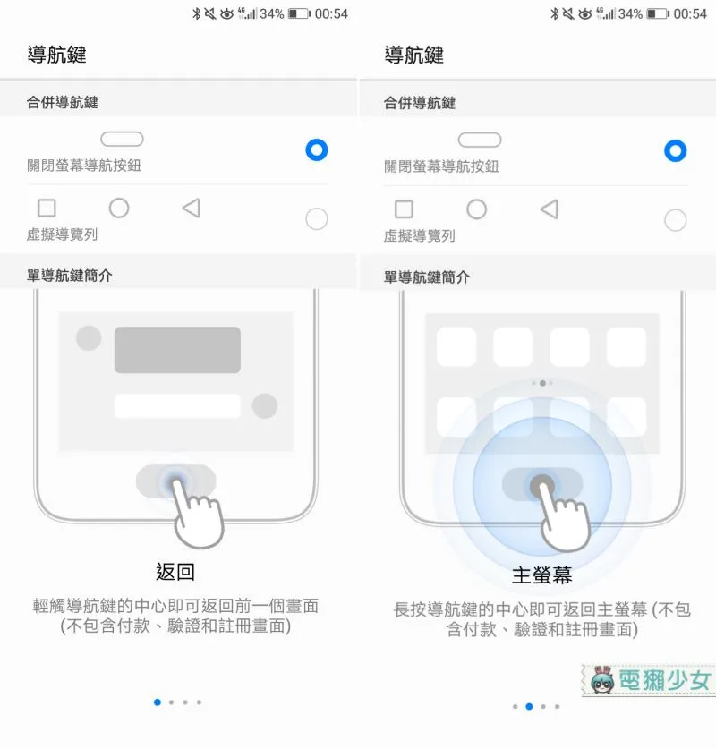 再来,刚有提到「HUAWEI MediaPad M3 Lite」它的Home键是轻触式的,但是它还可以结合手势操作,只要在「设定」>>「导览键」的地方可以看到各种手势的教学哟~