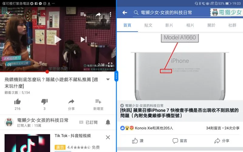 分割屏幕的概念大家应该都蛮了解了,就是你可以在一个屏幕上同时进行两件事情,像是一边滑脸书一边看 YouTube 等等,只要确定该应用程式有支持就可以萝~