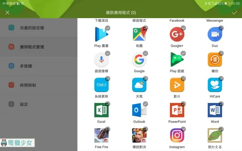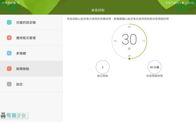 相信如果是家中有小孩的獭友,平板对他们的吸引力应该是相当大的吧~(现在的小小孩对平板的熟悉程度完全不容小觑啊…)当你拿出平板想给他们一点休閒娱乐又不想要他们太过沉迷的话有没有什麽好的方法呢?在「HUAWEI MediaPad M3 Lite」里就有一个内置的“儿童天地”应用,在这边可以设定要给小朋友看到什么内容、以及可以用多久等等的选项喔!对爸妈来说应该是个蛮实用的小工具