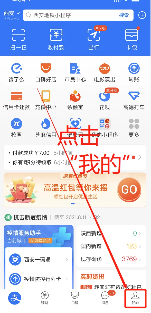 第一步:打开支付宝,点击下方菜单栏“我的”