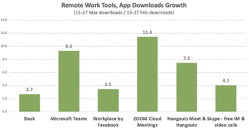很明显,全球疫情的蔓延,让协同办公saas领域获得了巨大的增长杠杆。大家可以继续看下面这张图,国外主流的各种协同办公软件,在3月份下载量都是激增数倍,Zoom会议软件更是增长了11倍!在B2B领域,你很难第二次看到这种赛道级的现象了。