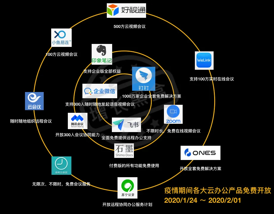 根据艾媒咨询数据显示,在 2020 年春节开工第一天,超过 1800 万家企业采用了线上远程办公模式,近 3 亿人开启在家办公模式。如同2003 年非典,开启了电子商务十年的黄金时代,2020 年新冠肺炎则开启了全民远程协同办公元年。一时之间远程办公领域风云涌动,进入群雄争霸的时代