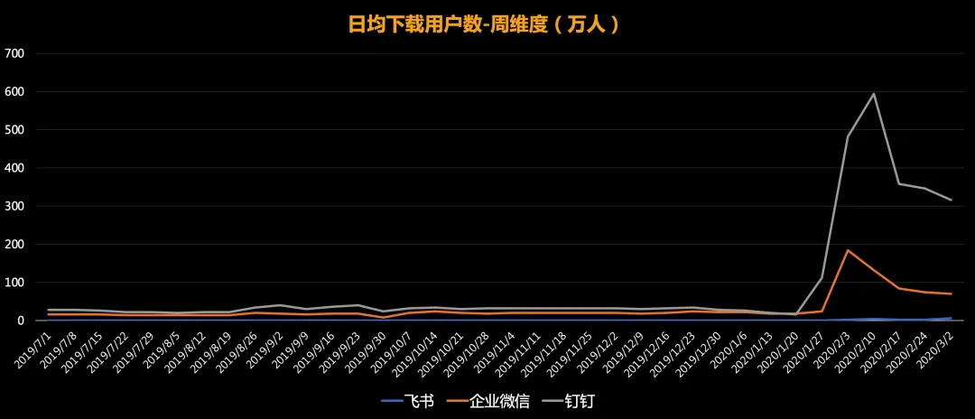 虽然目前在体量上无法和钉钉、企业微信相匹配。但要知道飞书的背后是有着,APP工厂之称的头条做技术的支撑。飞书在 2020 年 2 月 10 号,也迎来自家产品日均下载量的高峰。