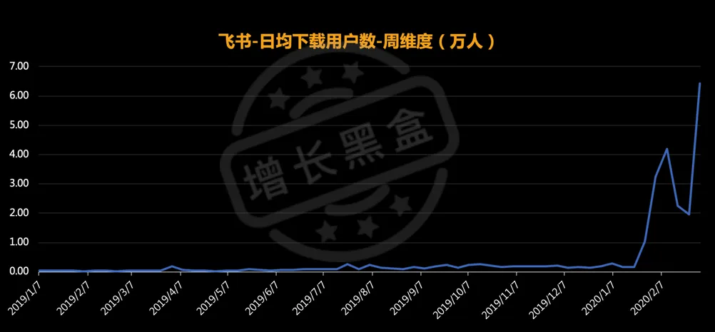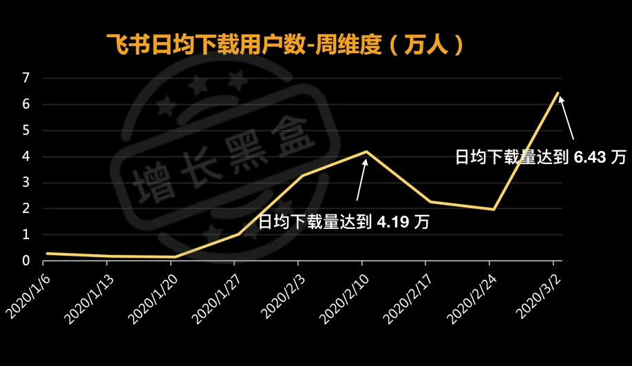 飞书在 2020 年 2 月 10 号,日均下载量达到 4.19 万;3 月 2 号达到日均下载量 6.43 万。