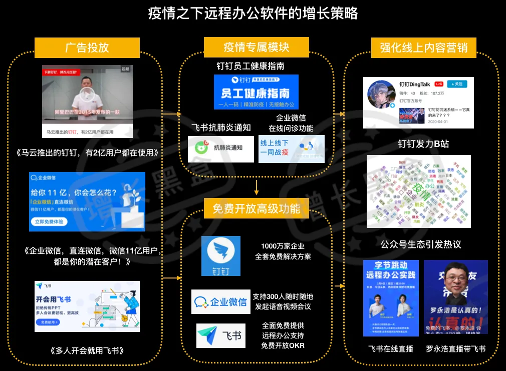三家产品在疫情期间的增长策略,可以用下面这张图来概括。每家产品都有进行广告投放,但钉钉和企业微信侧重品牌,而飞书侧重效果。都在疫情期间上线相应的产品模块,以应对市场的需求。而大家也不约而同,全面开放自己产品的高级功能。并且都是非常重视线上的内容营销。