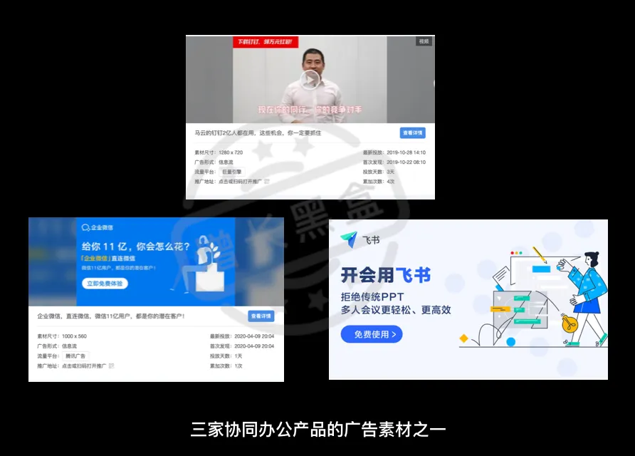做为三家巨头公司,为了推广自家的协同办公软件,一定是少不了在各大平台进行广告投放。都是不缺钱的大公司,在广告投放上基本都是大面积的撒网。虽然投放的数量三家都可以做的不分上下,但各家广告的推广侧重点却有很大的不同。
