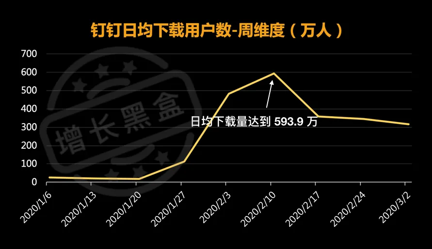 钉钉在 2020 年 2 月 10 号,日均下载量达到 593.9 万;