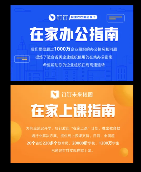 点击链接查看我们发现钉钉不仅帮助 1000 万企业提供高效的在家办公指南,还与 20 个省份的 220 多个教育局进行合作,让 20000所学校、1200万学生通过钉钉实现在家上课。