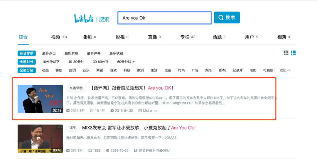 品牌经典的鬼畜案例,是小米雷军的 Are you ok 的视频,该视频在 B 站上 2015 年 4 月 30 日发布,目前已有 2694.4 万的播放量。直到 5 年后的今天还经久不衰,B 站的用户无人不知雷军的 Are you ok。