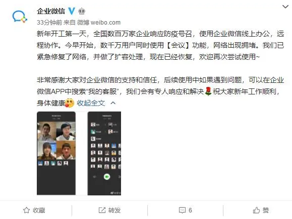 企业微信也称,全国数百万家企业使用企业微信线上办公。早上,企业微信的会议功能访问量激增,出现短暂限流。