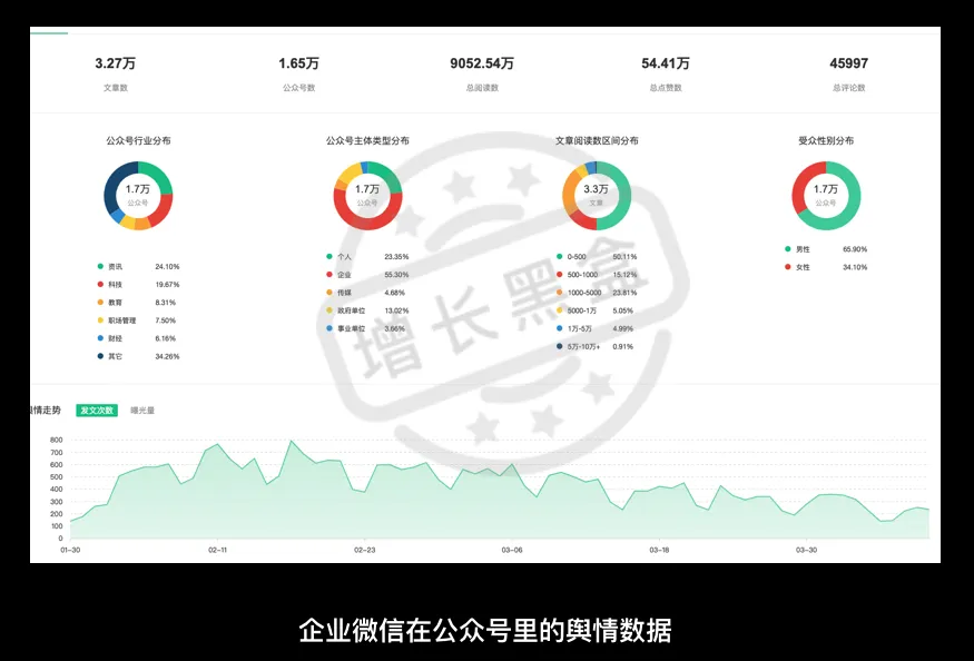 这两次大版本的更新,在微信生态里引起了大规模的热议。我们通过西瓜数据的品牌舆情分析发现,在 2020 年 1 月 11 日至 2020 年 4 月 10 日的期间,共有 3.27 万相关的文章,涉及 1.65 万的公众号,总阅读数达到 9052.54 万的阅读。