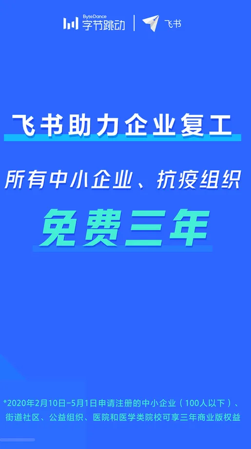 在 2020 年 2 月 9 日这天,飞书在抖音上举办了一场名为《字节跳动远程办公实践》在线分享。字节跳动副总裁谢欣,通过直播分享了字节跳动五万人在家办公背后,飞书对于远程办公的思考和实践。并且宣布:将为所有中小企业和抗疫组织,提供飞书为期3年的商业版免费使用权。