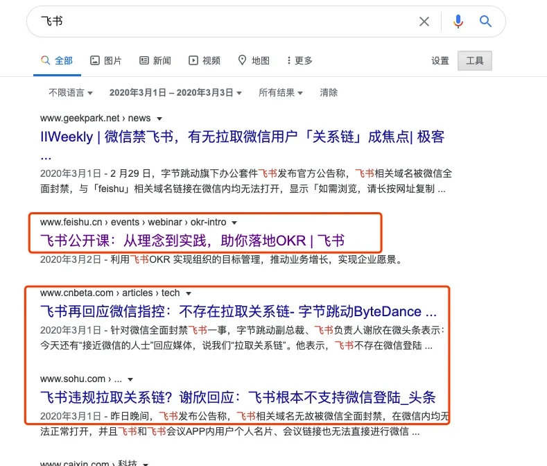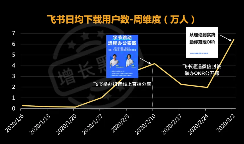 在最初的飞书增长图大家应该还注意到 3 月 2 日,飞书又达到新的增长点。而这期间发生了一个事件,飞书相关域名被微信全面封禁。封杀飞书成为了那个时间各大自媒体平台热门的话题,而飞书也在 3 月 2 日又开启一场公开课《从理念到实践,助你落地OKR》。