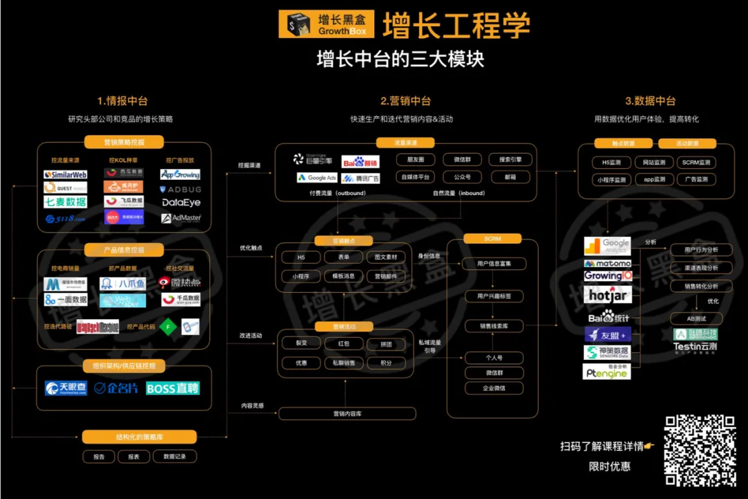 我们将会通过五天的时间,带领你了解系统化增长工程中必不可少的三个要素:情报中台、数据中台和营销中台,以及如何从市场上挖掘增长策略。