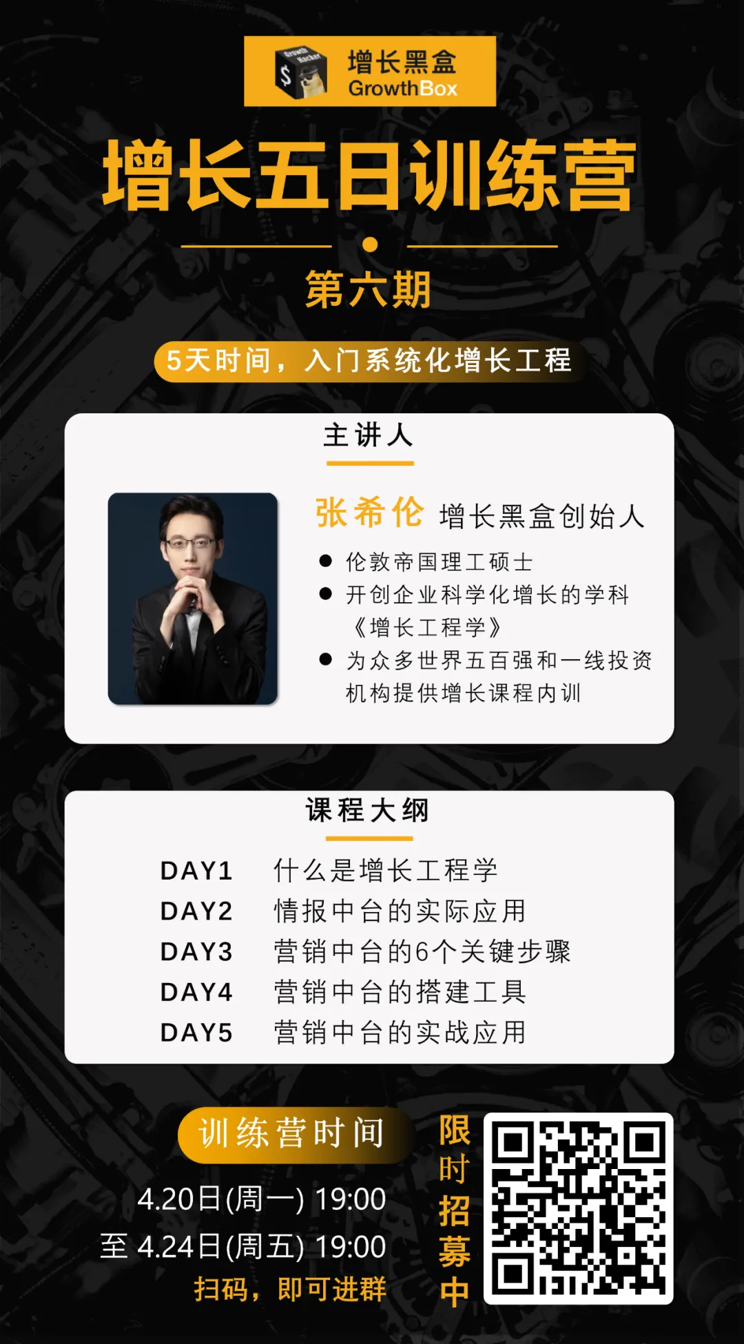 扫描下方海报二维码,即刻参与我们的《增长五日训练营》。你将获得: