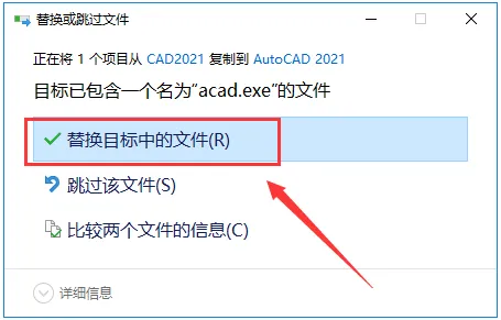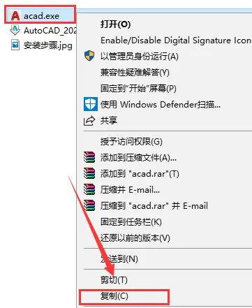 13.打开之前安装包解压后的【CAD2021】文件夹,选中【acad.exe】文件,鼠标右击选择【复制】。