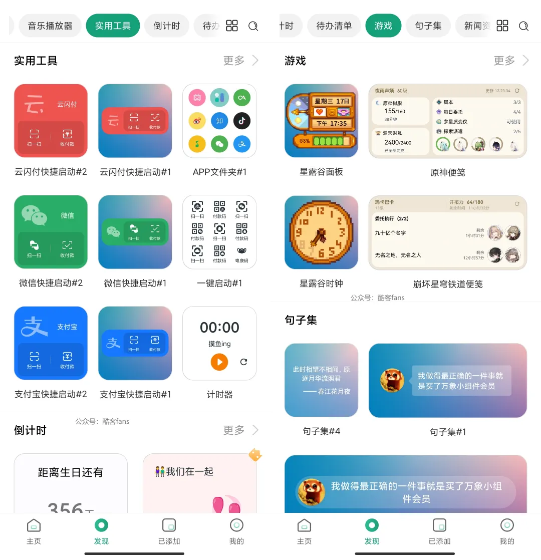安卓手机第三方小组件应用。根据官方的说法,软件集合了 100+ 不同样式、不同功能的小部件,涵盖桌面图片、实况天气、桌面文字、每日一句、APP大小文件夹、星座运势、倒计打卡、电池电量、物流查询等等非常丰富的小部件分类。