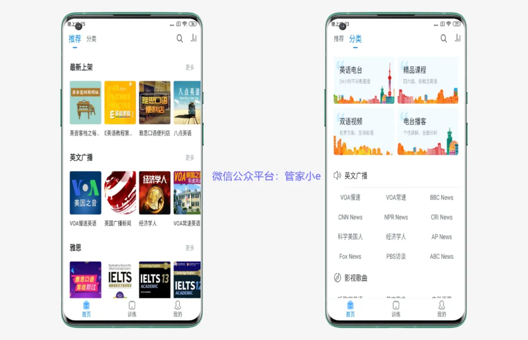 首页推荐中包括了最新上架、英语广播等等非常多的英语学习资源,分类中也包括了非常多的学习渠道。类型实在是太多了,只有你想不到,广播、电台、视频、新闻都有。