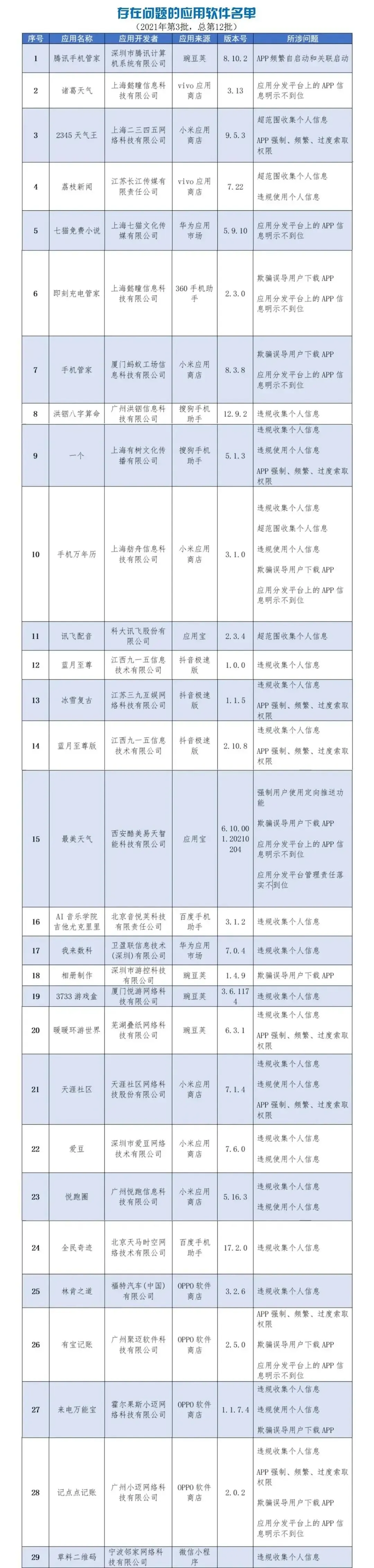 近日,工业和信息化部官网发布《关于侵害用户权益行为的APP通报(2021年第3批,总第12批)》,依据《网络安全法》《电信条例》《电信和互联网用户个人信息保护规定》等法律法规,按照《关于开展纵深推进APP侵害用户权益专项整治行动的通知》(工信部信管函〔2020〕164号)工作部署,工信部近期组织第三方检测机构对手机应用软件进行检查,督促存在问题的企业进行整改。截至目前,尚有136款APP未完成整改。