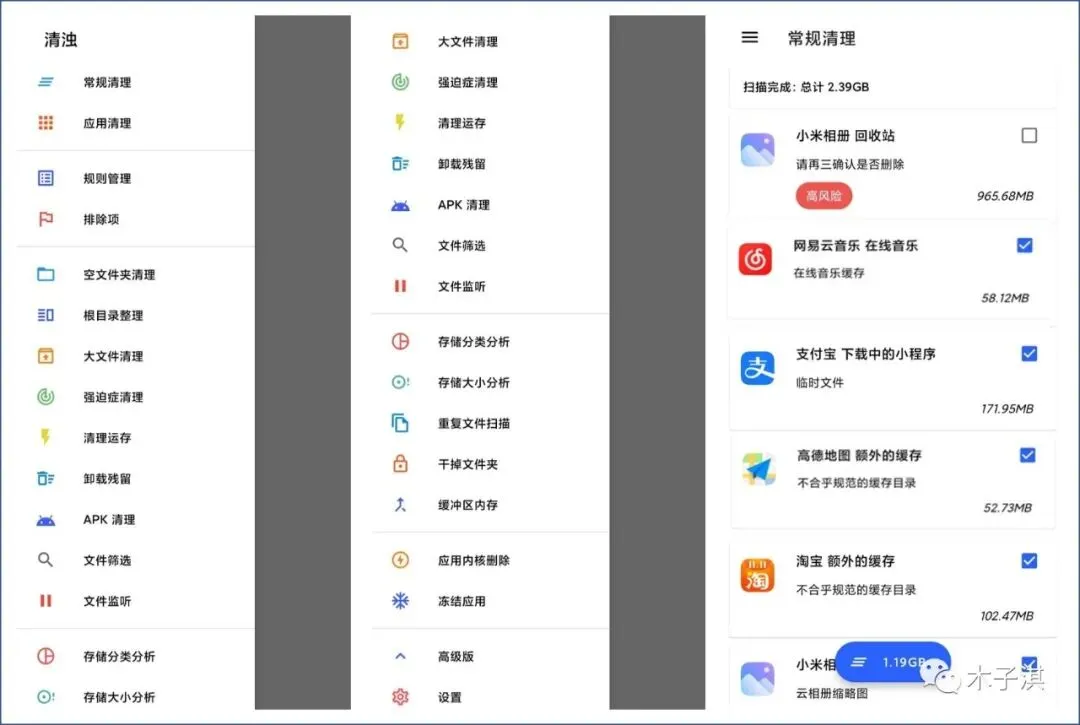 点击左上角的三个横杠,就可以看到软件的所有功能清晰展示,我们可以看到软件的功能非常强大,包括:常规清理、应用清理、空文件夹清理、根目录清理、大文件清理、清理运存、卸载残留、APK 清理、文件筛选、存储分类分析、存储大小分析、重复文件扫描等。