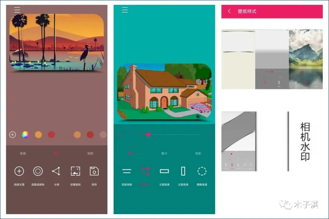 它的阴影设置支持 10 多种不同类型的主图阴影,你可以随意切换,尝试不同阴影效果,体验不同颜色的状态栏,找到自己满意的壁纸效果。