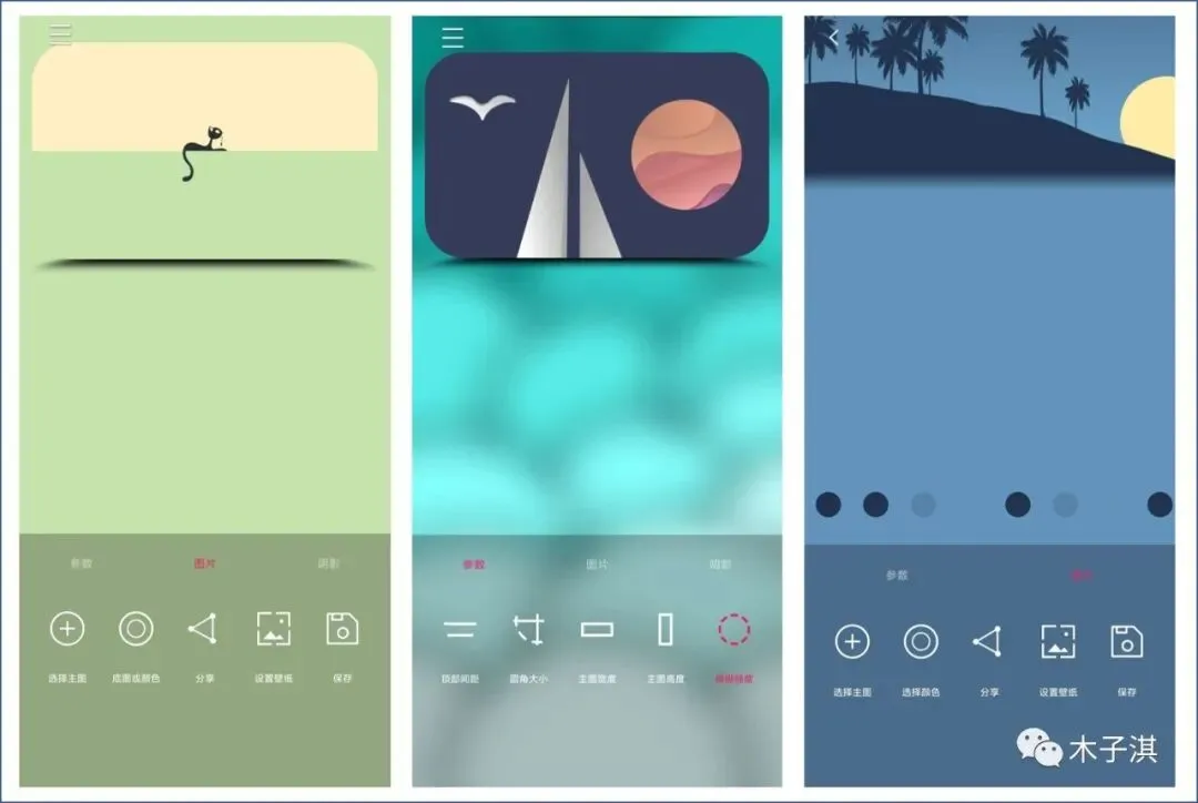 其中图片包括:选择主图、选择底图和颜色、设置壁纸、保存壁纸,参数包括:顶部间距、圆角大小、主图宽度、主图高度、模糊强度,阴影包括:主图阴影、状态栏阴影、状态栏颜色。