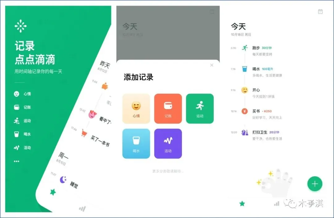 打开软件,点击主界面的加号按钮就可以开始记录,目前支持的分类包括:心情、记账、运动、喝水、活动。