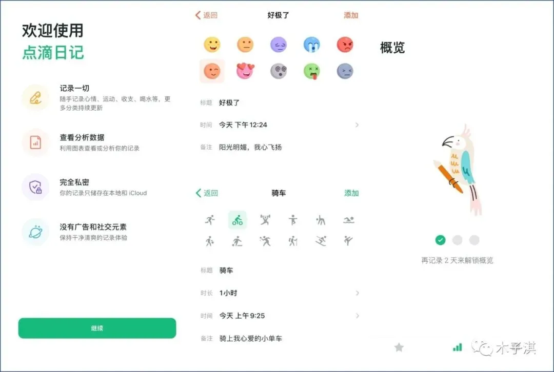 它采用极简设计,整个软件非常好看,颜值极高,提供了非常多可爱的图标,没有任何多余的东西和社交元素,支持以时间轴的方式记录每天发生的事情。