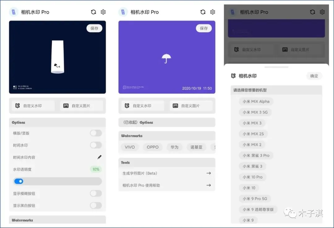它的使用方法非常简单,每个功能按钮都是清晰明了,支持多个手机品牌,支持自定义水印,支持添加时间水印,支持设置时间水印内容。