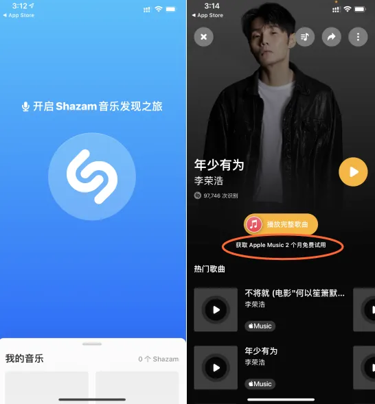 在App Store搜索安装好这款软件后打开,然后听歌识曲一次,在识别结果下面就能看到「获取Apple Music 2个月免费试用的选项」。