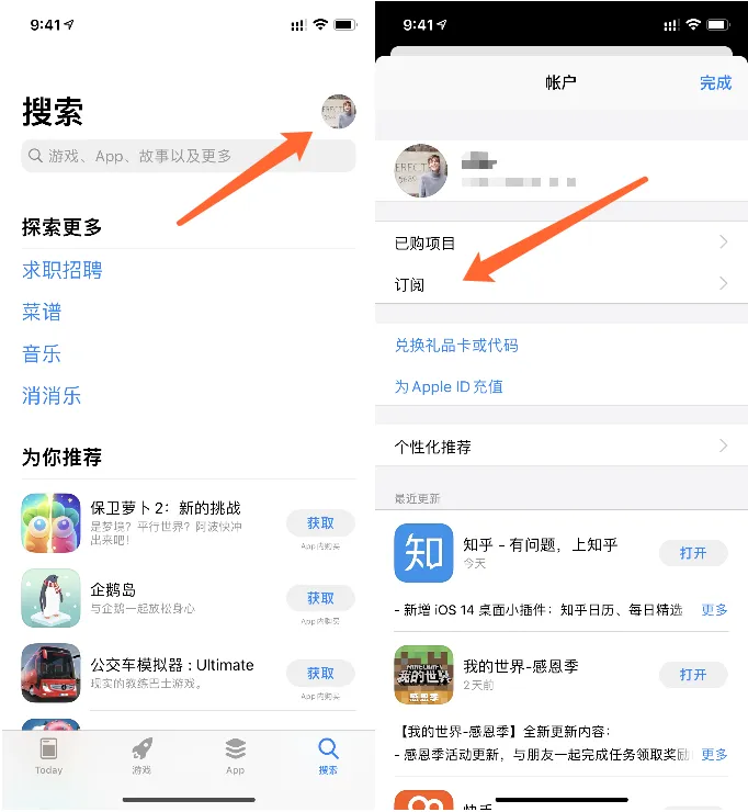 打开App Store,点击右上角的头像,点击订阅。