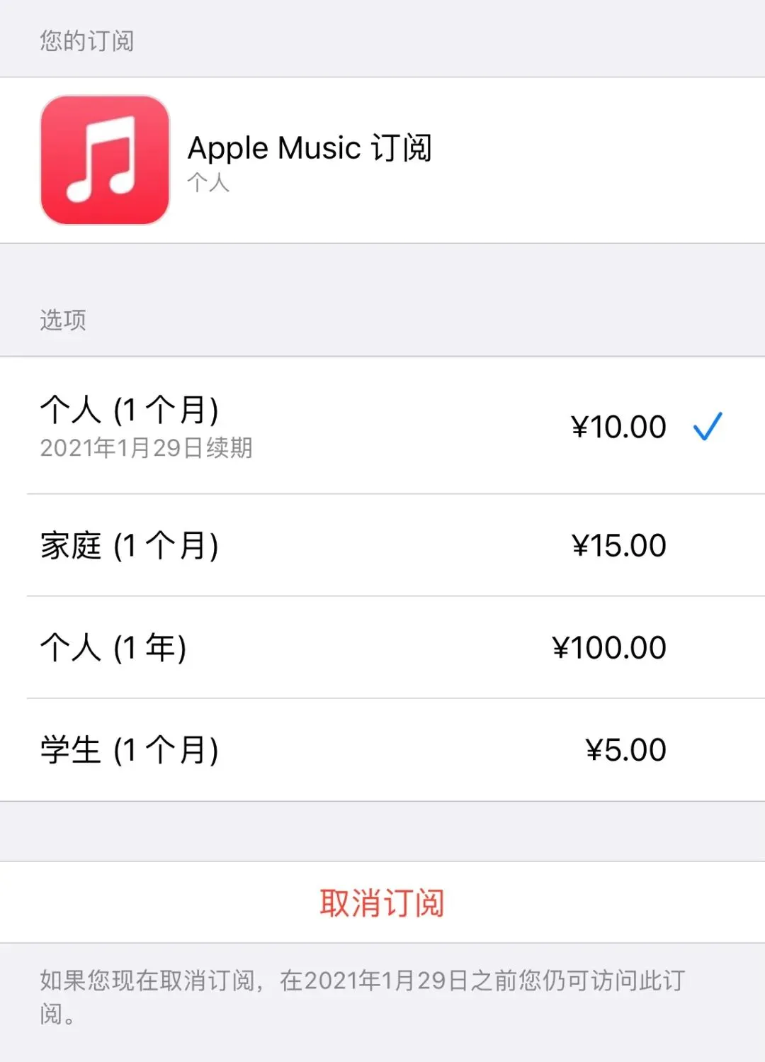 然后找到自己的Apple Music订阅,点击底部的取消订阅即可,提前取消订阅不会减少已经领取的免费会员。