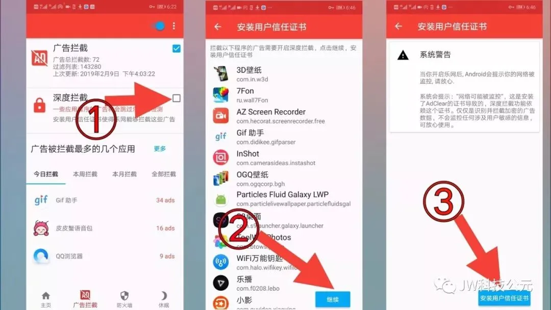在广告拦截页面,点击「深度拦截」→点击「继续」→再点击「用户信用证书」进行安装即可。