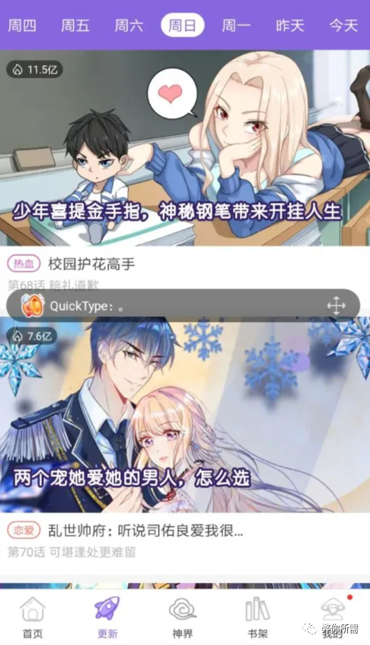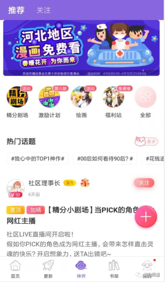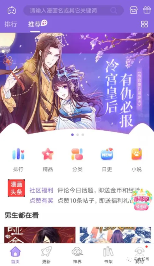 app主要使用的是首页和更新这两个类别。在首页中,把资源分为了:排行和推荐。排行榜分为:综合榜、自制版、新作榜、黑马榜、付费榜、少年班、少女榜等等。