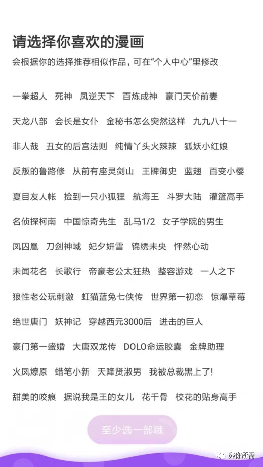 第一次使用app的时候需要选择两个问题:你是男生还是女生;你之前看过、喜欢的漫画。回答完上述两个问题之后,就可以正式使用app了。