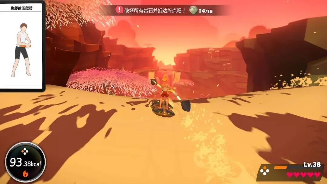 我教她怎么在游戏里用收集到的食材制作果汁,教她怎么用指定颜色的健身动作对敌人造成更多伤害,她已经有点习惯了照着屏幕上的指示进行各种操作,遇到金币的时候也知道怎么用各种体感操作将金币收入囊中。