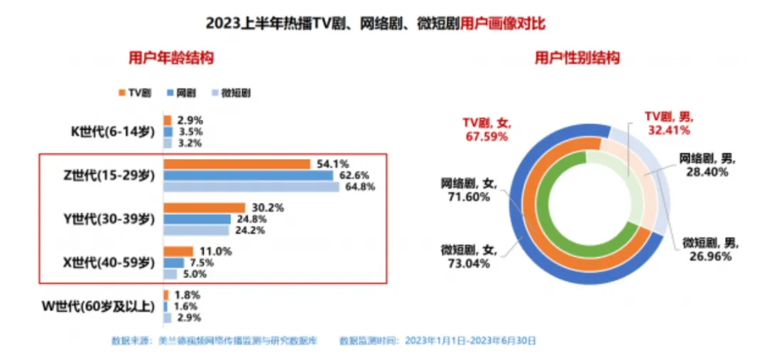 体感上微短剧火了,那么实际上呢?根据美兰德数据显示,在2023上半年不少长视频平台集中发力,共推出微短剧约279部,同比增长约80%。还有一个信息是,微短剧在年轻群体和女性用户中极受欢迎:在2023年上半年热播微短剧的用户画像中,有64.8%的用户是Z世代(15-29岁),有73.04%的用户是女性用户。都说年轻人和女性用户才是消费的主力军,那么上面这些数据就已经很能说明问题了。