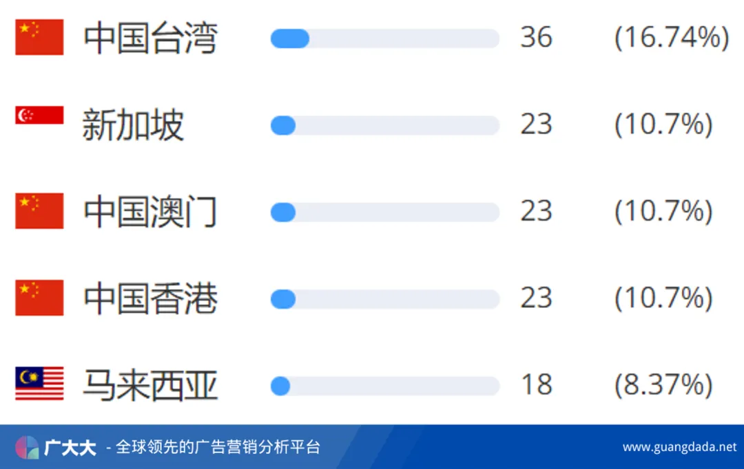 新阅时代在今年6月推出【GoodReels】加入微短剧出海内卷,从其投放数据来看目前还属于试投放期间,投放占比最高的地区为中国台湾地区,占比超过16%。
