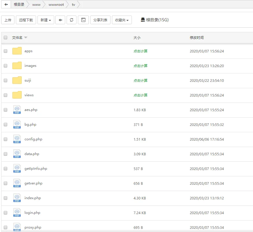 首先登录宝塔面板,将骆驼IPTV的后端源码上传至服务器并进行解压。(iptv.zip文件即为后端源码)