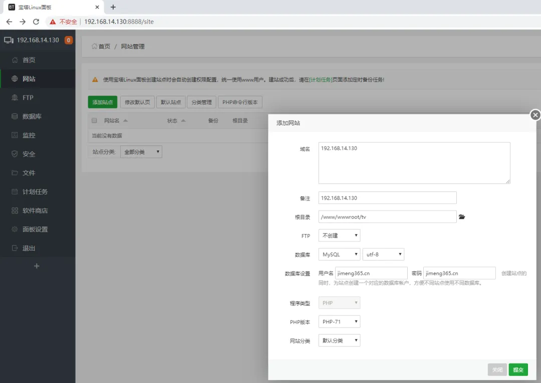 添加域名并将其根目录绑定到iptv后端源码的文件夹,数据库选择MySQL,PHP版本我这里选择的是7.1。