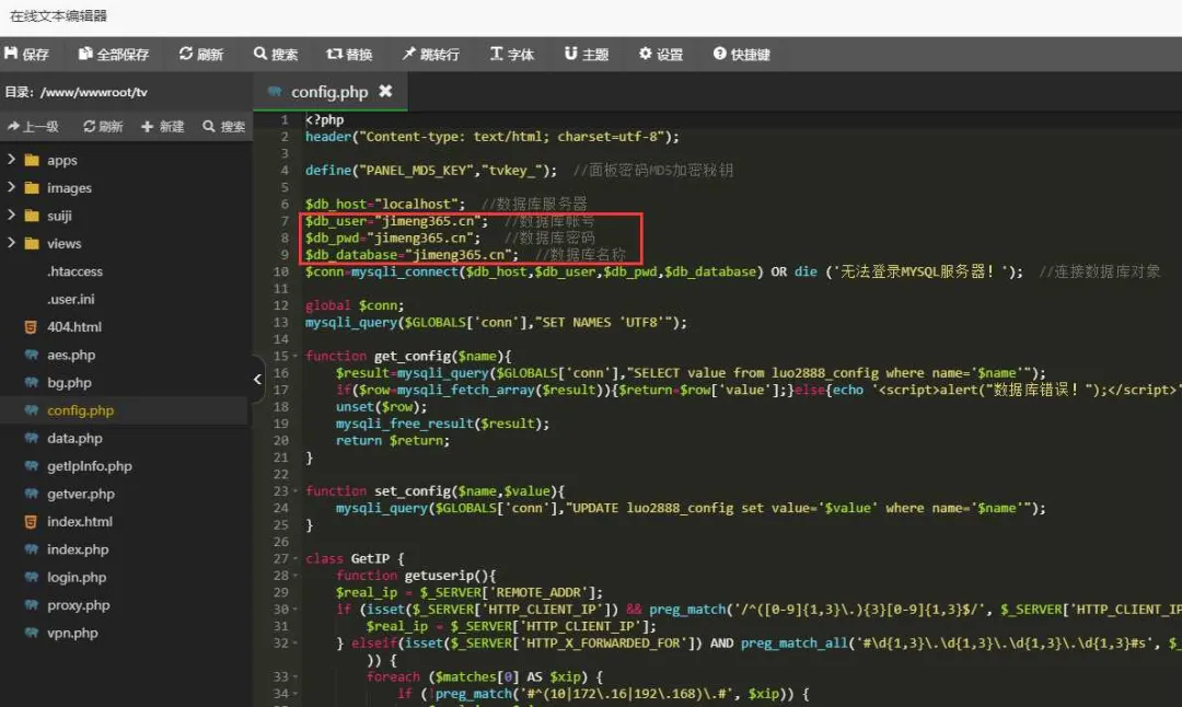 接着直接修改 config.php 里的数据库信息,修改里面的数据库名、数据库密码、数据库账号。