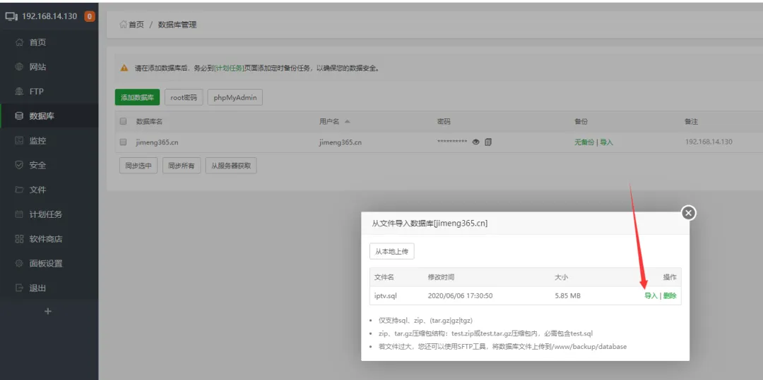 接着上传数据库文件,在宝塔面板中点击数据库 — 导入 — 本地上传 — 选择数据库文件上传 — 上传完成后点击导入即可。(iptv.sql即为数据库文件)