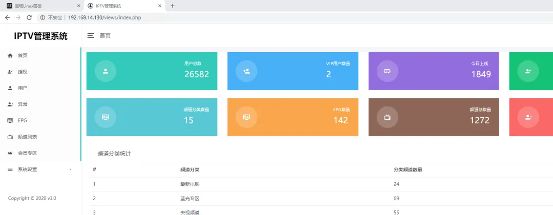 这里分享的新骆驼IPTV是完美版本的,EPG、会员管理、套餐管理、天气之类的统统都有,不是网上流传的那种不完整版,这个是亲测可用的,余生的云梦TV就是用这套源码搭建的。