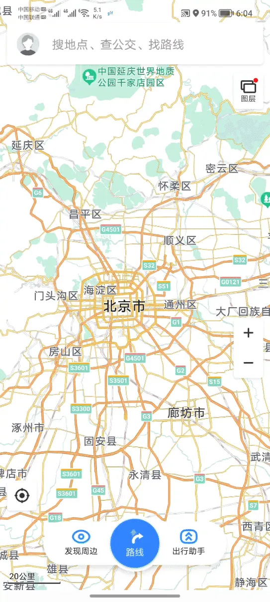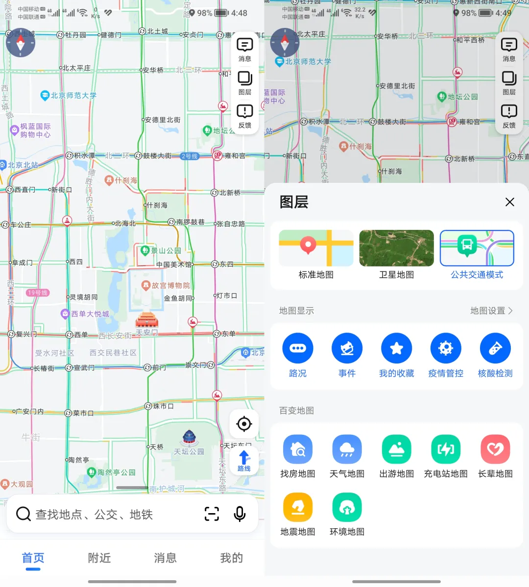 整个界面只有地图和一些常用工具,首页下拉烦人的广告资讯也完全消失了,整体非常清爽,这才是一个地图应该有的样子。